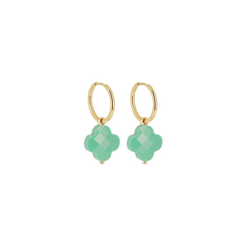 Boucles d'oreilles créoles en acier doré à l'or fin sur lequel est attachée un trèfle en verre.