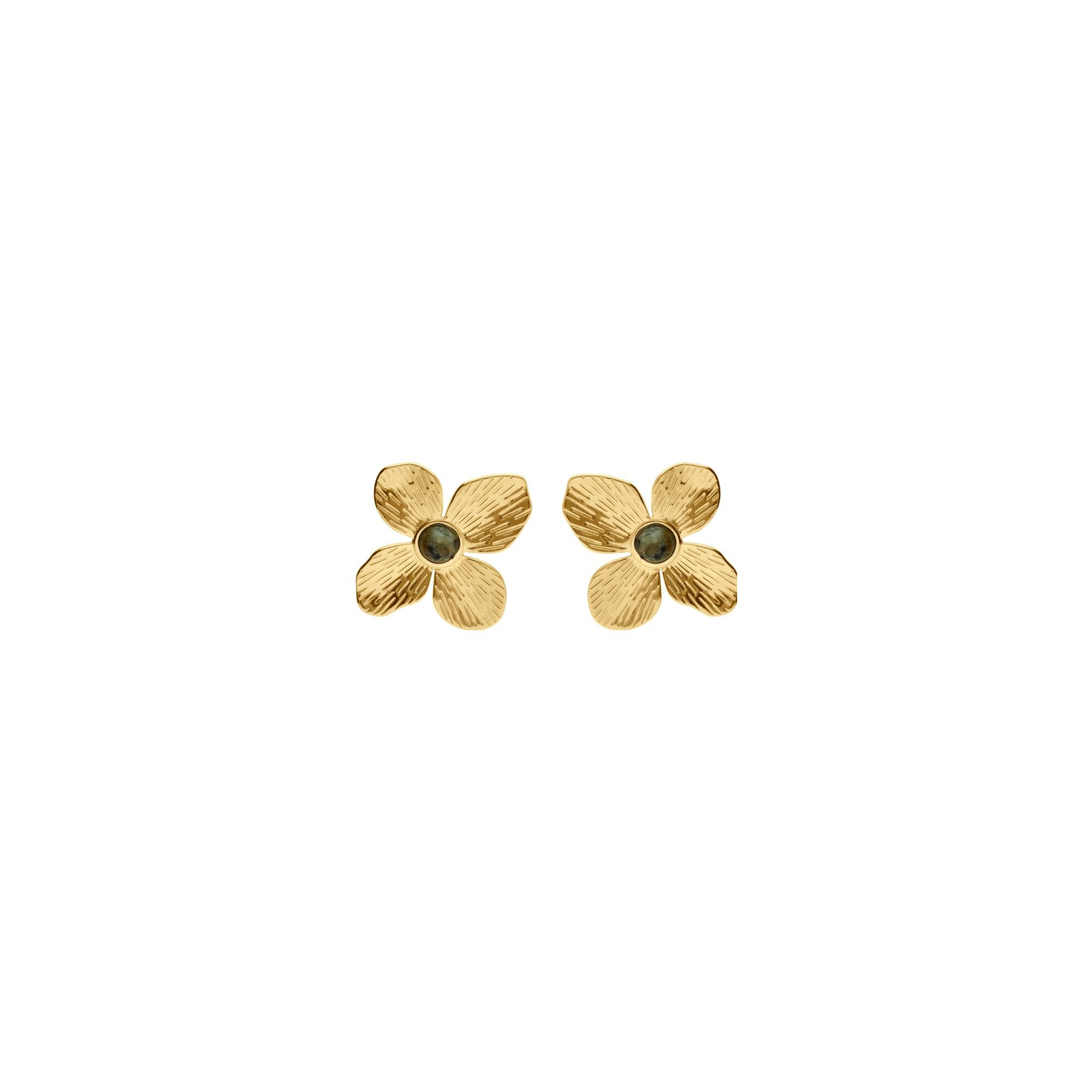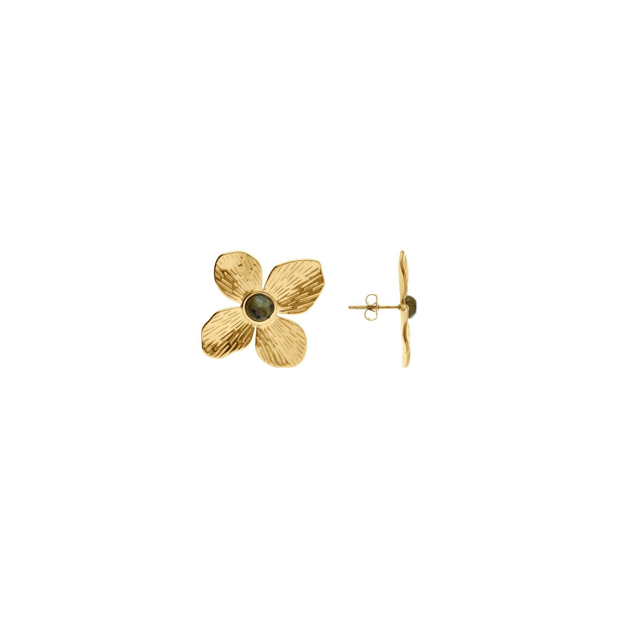 Boucles d'oreilles tige acier doré jaune fleur 30x30 avec turquoise africaine reconstitué Description détaillée
