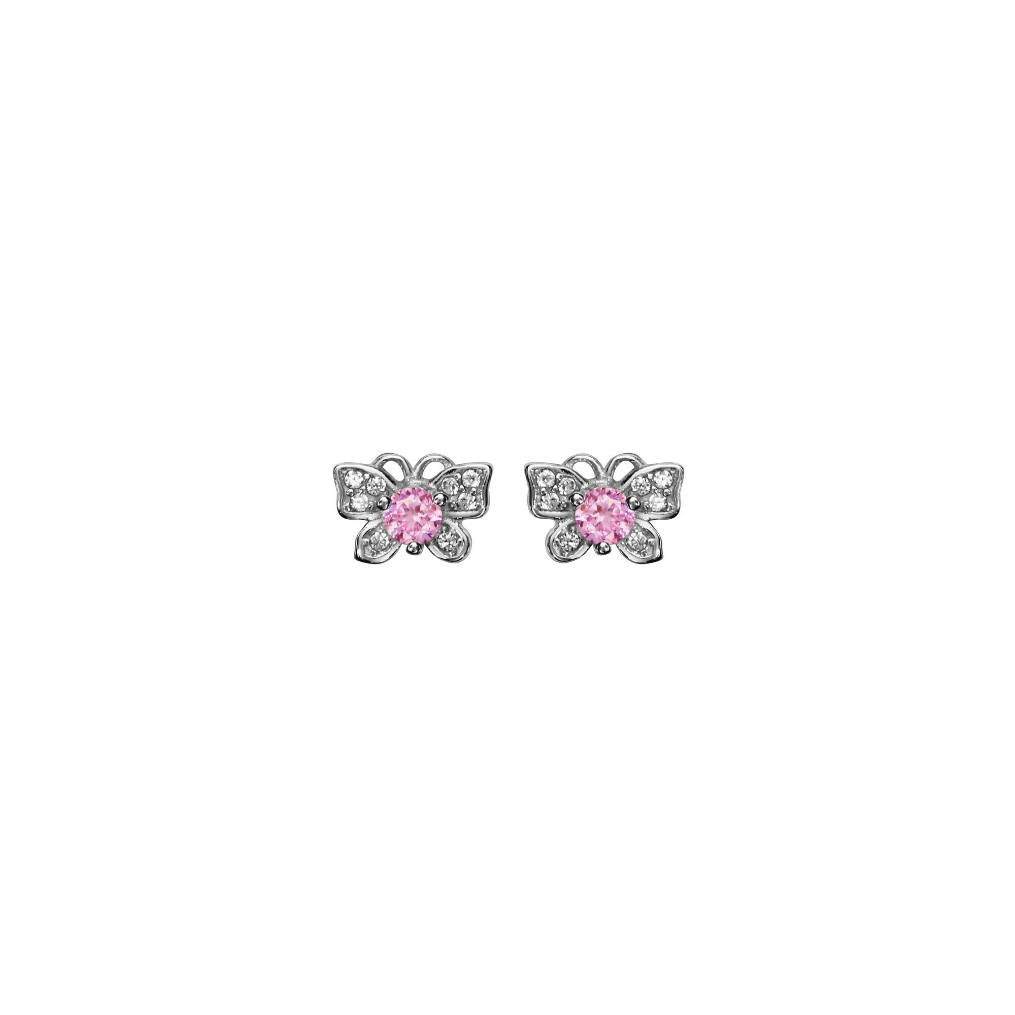 Boucles d'oreilles tige argent rhodié papillon oxydes blancs et pierres centrale rose synthétique Description détaillée