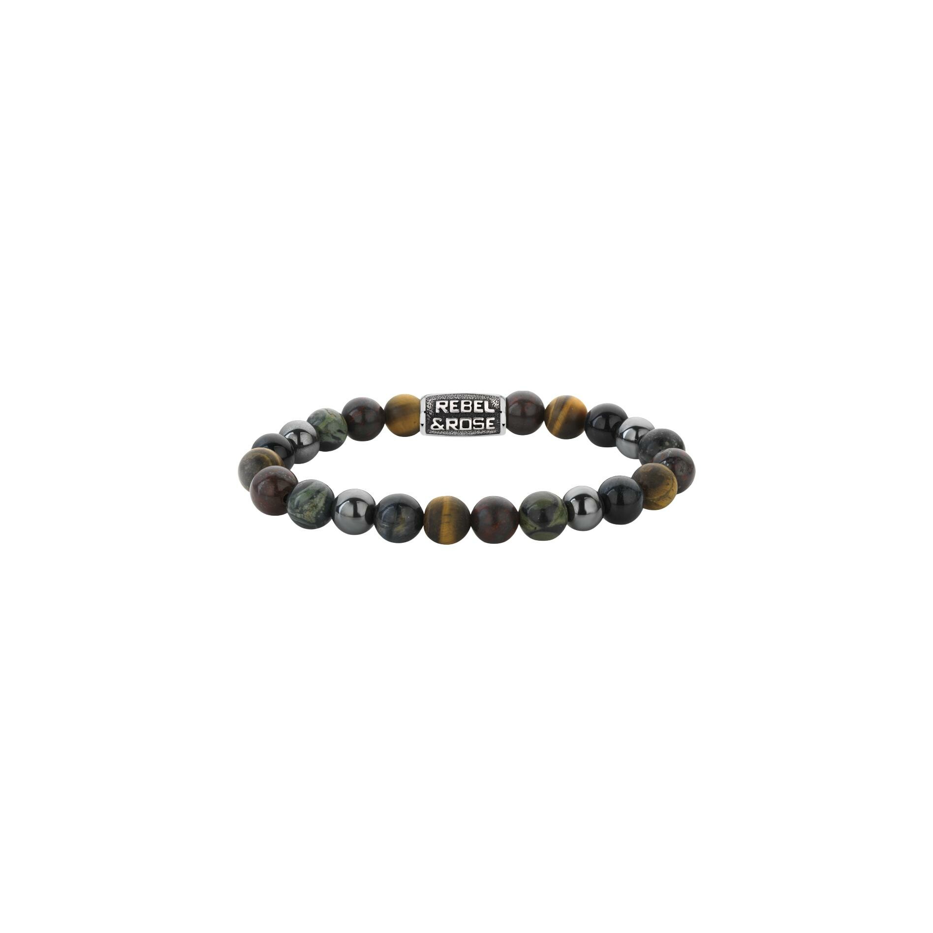 Bracelet Rebel & Rose More Balls Than Most en jaspe bréchique, rhyolite, hématite grise, œil de tigre bleu et jaune, taille M Description détaillée