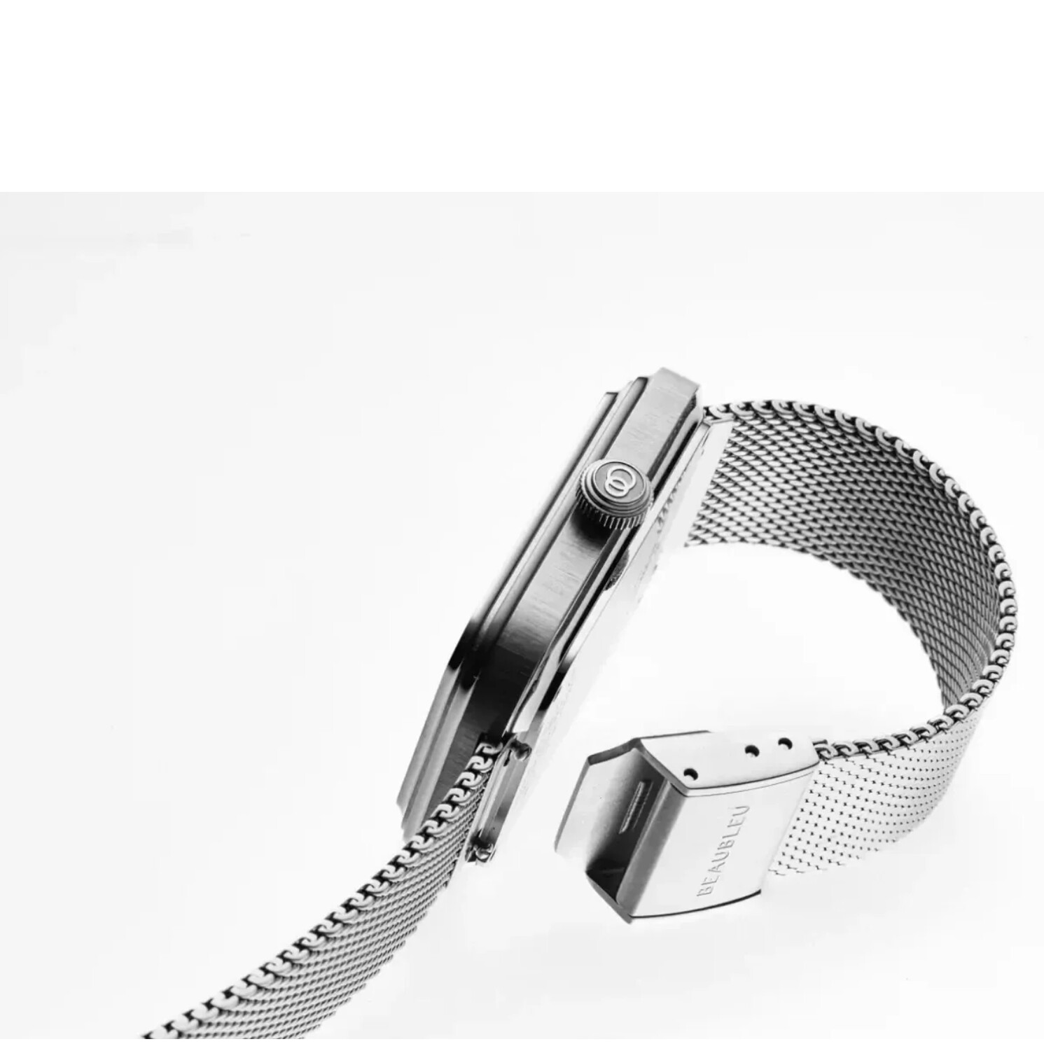 D’une largeur de 30 mm, le boîtier semi-octogonal s’inscrit dans l’architecture singulière de la Maison Beaubleu. Ses lignes, à la fois franches et subtilement incurvées, prennent forme dans une alternance maîtrisée de finitions polies et brossées.