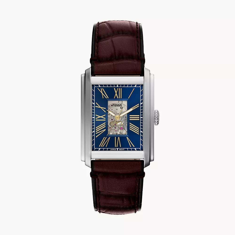 Cette montre Carraway conçue avec soin jusque dans les moindres détails est un véritable classique. Le mouvement automatique est visible à travers le fond ouvert du boîtier et le cadran squeletté, ajoutant un détail fonctionnel axé sur le design. Aussi intemporelle que confortable, elle présente un cadran bleu classique, un boîtier incurvé adapté au poignet et un bracelet en cuir marron façon croco avec une doublure en nubuck doux.