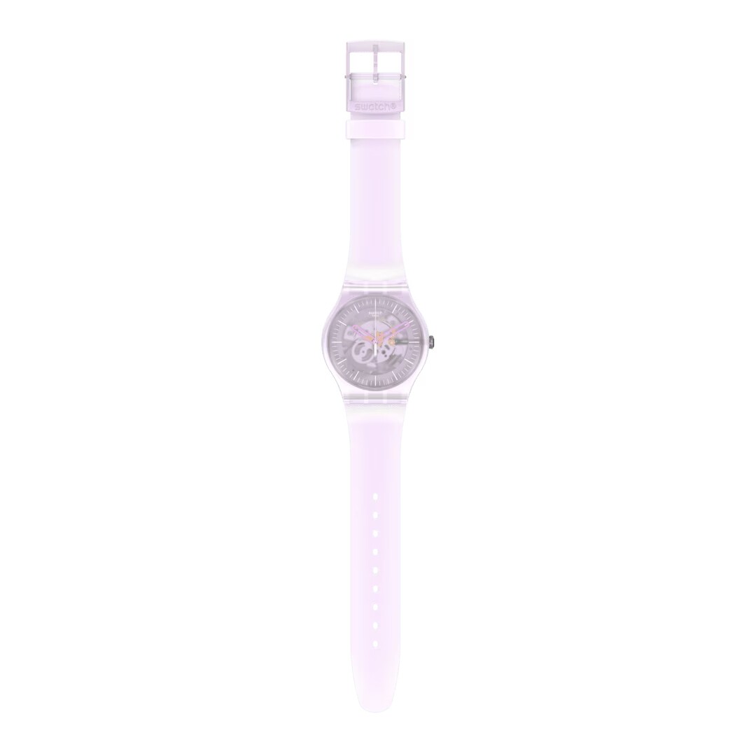 Ce modèle enchanteur présente un effet irisé, créant un doux éclat doré et violet. Son bruit de coucou révèle le mouvement signé Swatch.