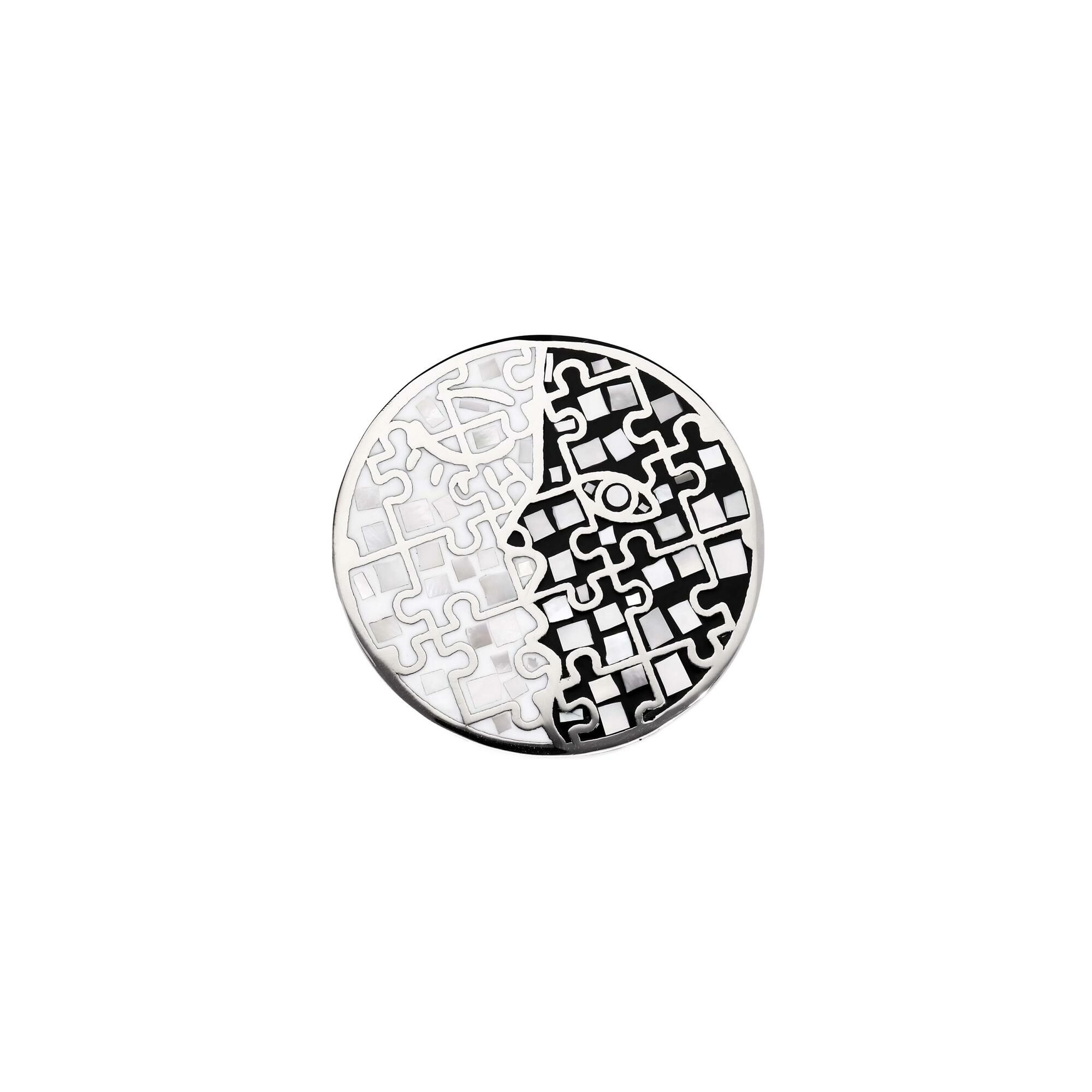 Pendentif Stella Mia rond en acier, résine noire et blanche et nacre Description détaillée