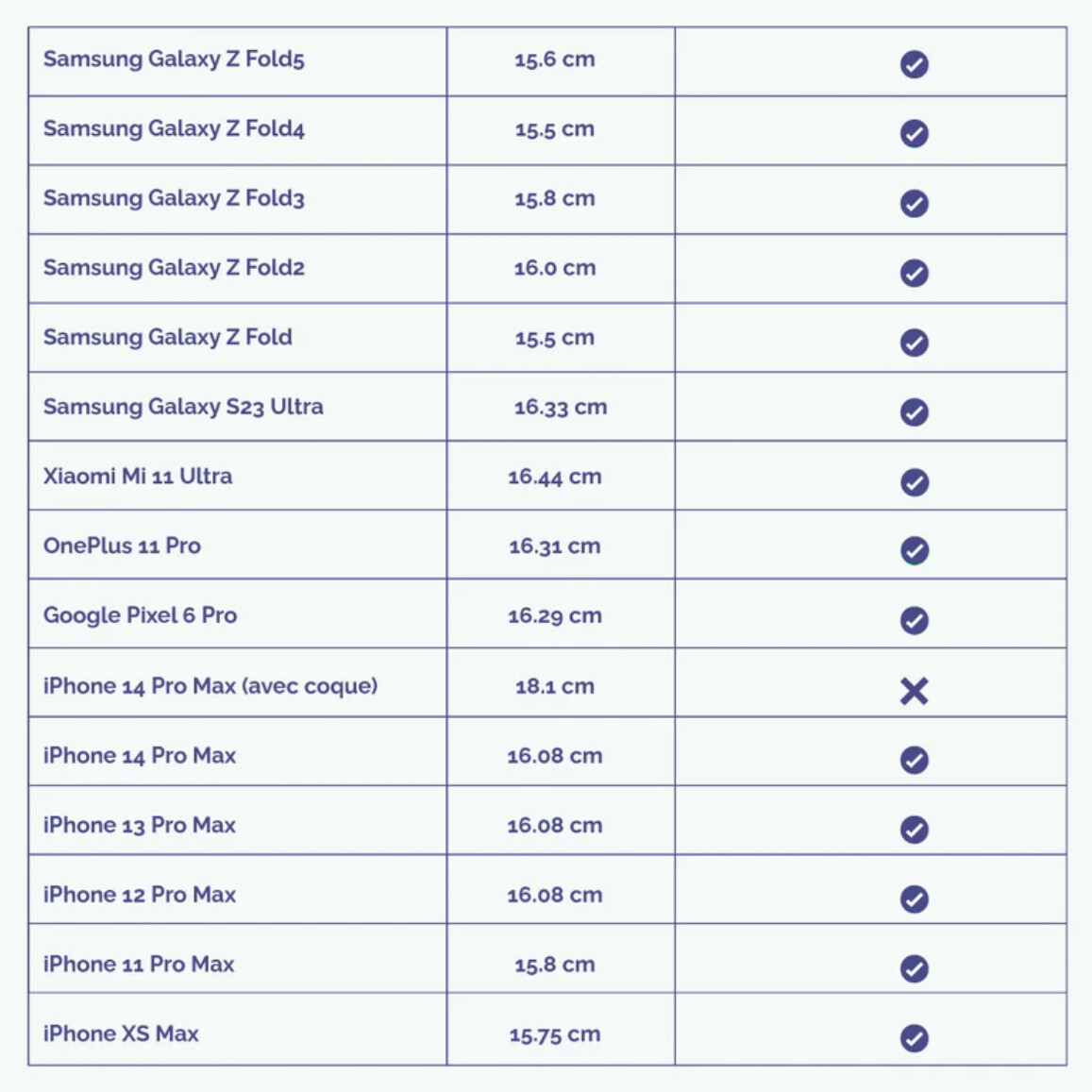Les téléphones d'une hauteur de 18cm maximum entrent dans le sac.